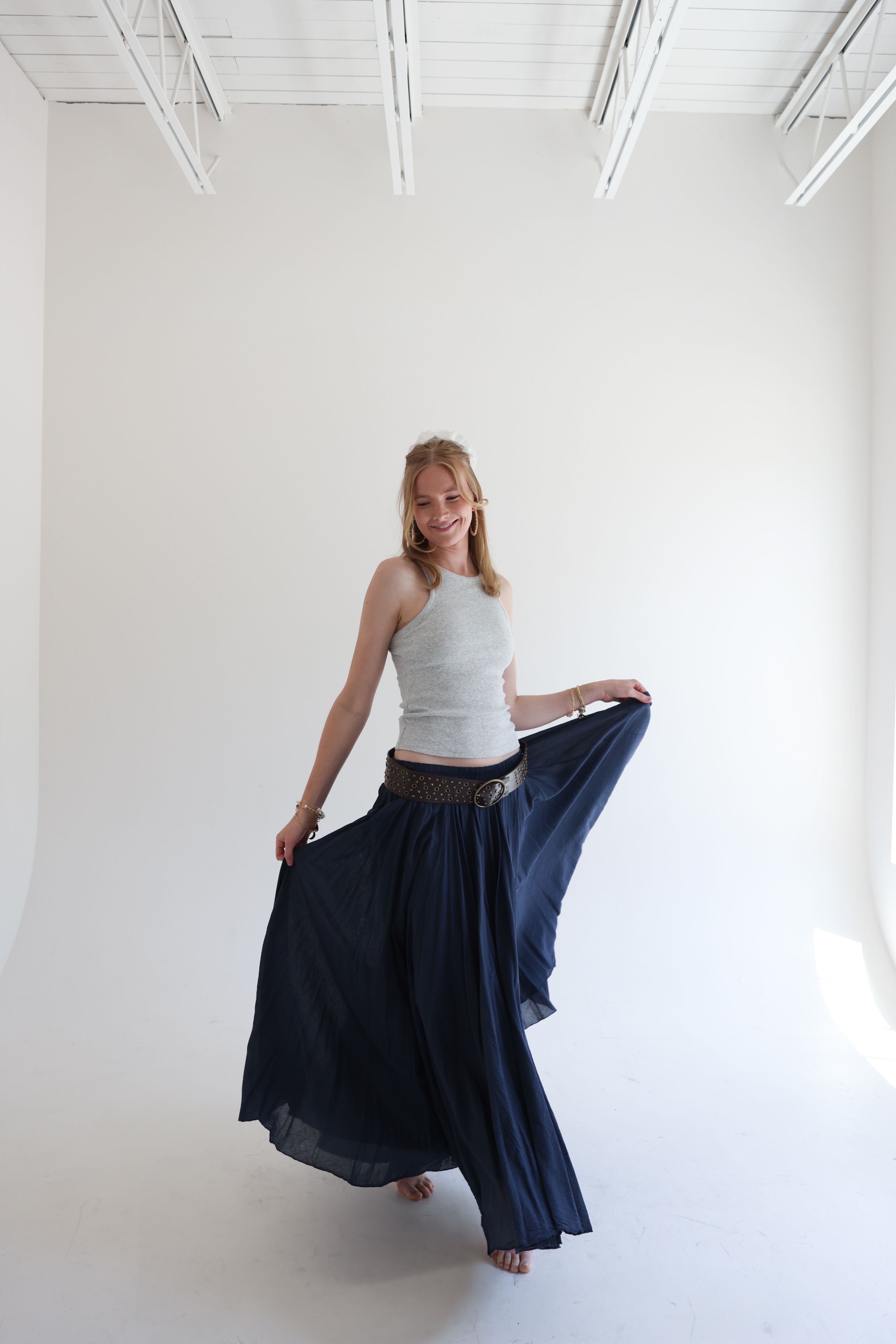 The Breezy Skirt is a flowy, ankle-length skirt made from lightweight crinkled cotton for an airy, effortless feel. Designed with a soft elastic waistband and full silhouette, it moves beautifully with every step-perfect for warm days, travel, or laid-back styling.