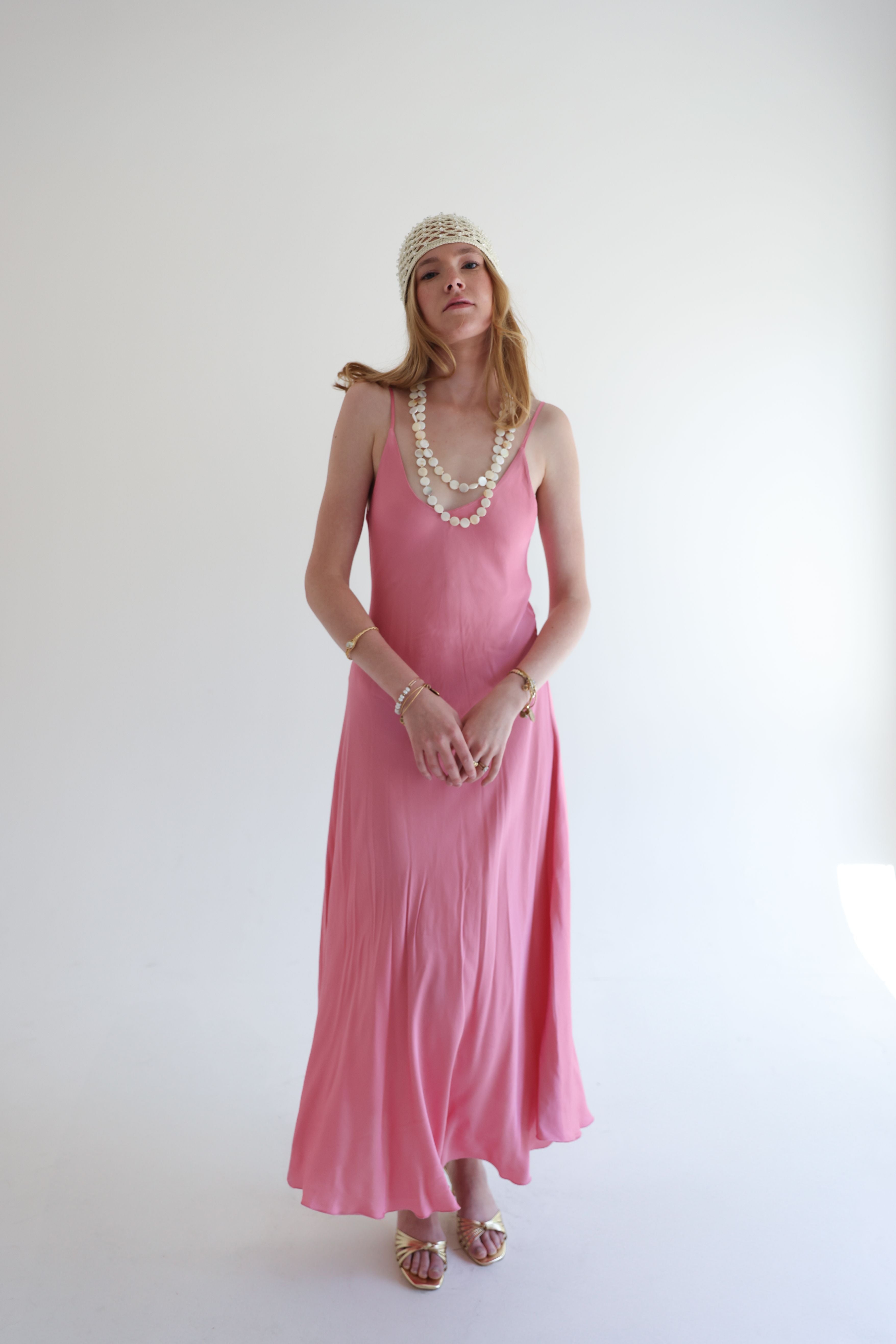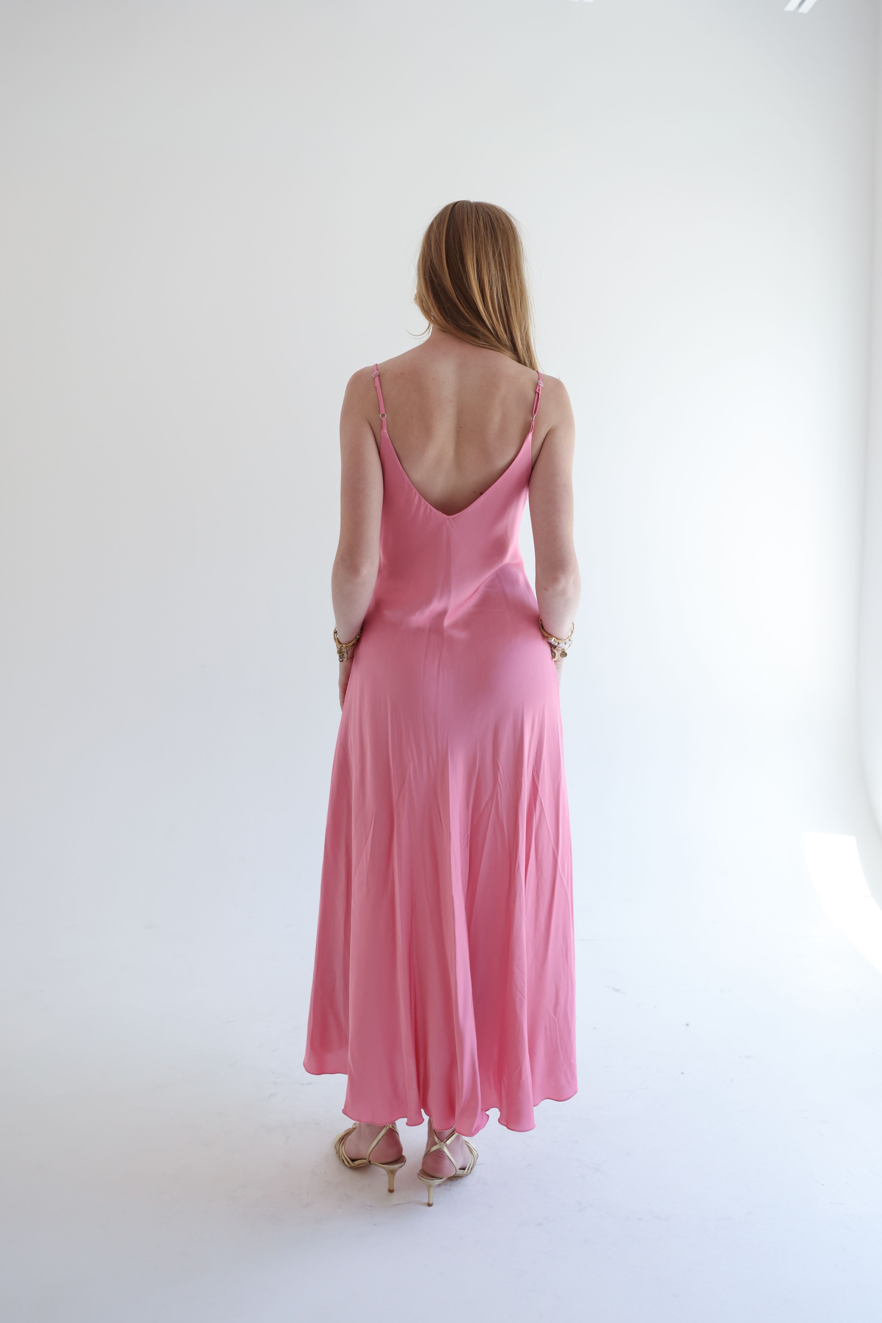 The Capri Dress is a silky satin maxi dress in a soft rose pink, designed with a relaxed fit and graceful drape. Its scoop neckline and flowing silhouette create an effortlessly feminine look, perfect for warm days and elegant evenings alike. Style it with your favorite accessories for a look that transitions with ease from day to night.